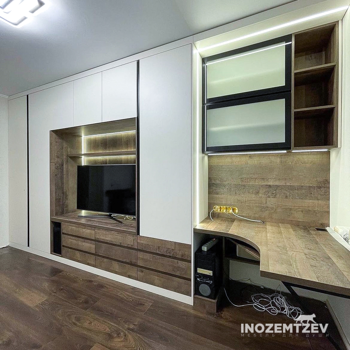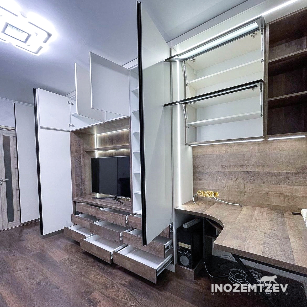 Стильная стенка с нишей под телевизор с подсветкой, с распашными шкафами, выдвижными ящиками, радиусным столом под компьютер и надстройка с откидными дверцами